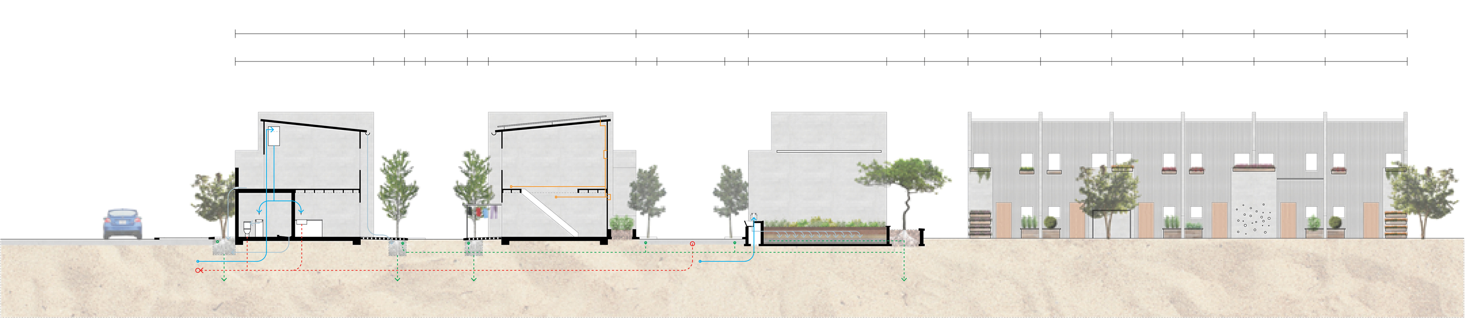 A main focus of the project is on the creation of sustainable landscape elements that help mitigate the use of water and other services through innovative low-tech solutions such as the capture, treatment and reuse of greywater. Water sensitive urban design elements like tree pits and reed channels also control flooding issues. These elements were designed in direct collaboration with the residents in order to be implemented successfully.